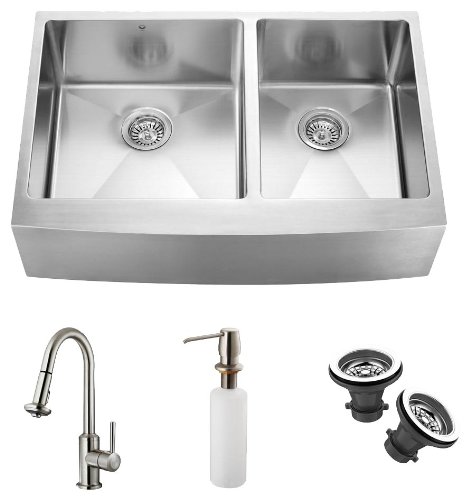 FeaturesWidth: 33-Inch - spout reach: 8.875-Inch - spout height: 16.5-Inch - length: 22.25-InchUndermount sinks categoryStainless steel finish optionsContemporary / modern styleQuick ship VIGO VG15098 Farmhouse Faucet Two Strainers Dispenser Double Bowl Kitchen Sink, Steel?