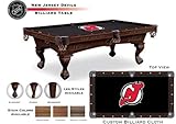 | ✚✚✚ New Jersey Devils 8' Pool Table - Traditional Mahogany Don't miss out on this American made custom pool table. Free installation by a professional installer is included. This is the 8' Traditional Mahogany version. Leg choices are shown above. We will contact you after the purchase to receive your leg choice. This officially licensed pool table features the team name on the apron. This table is hand crafted for Holland Bar Stool Co. by Olhausen MFG., one of the premiere billiard manufacturers in the world. Table has a 1.5'' thick 100% solid hardwood frame. The top rails, aprons, and legs are made from hand selected solid Maple. Finish is hand rubbed to accentuate the fine qualities of the Maple giving you a beautiful, durable and long lasting table. Logo and lettering are detail-engraved into the wood. Playing surface is made with a 1'' thick slate top. Surface is covered with a 21 oz. 80-20 blended wool billiard cloth made by Hainsworth of England. Logo is applied to the cloth using Hainsworth's patented technique, ensuring that gameplay is never compromised. Made in the USA with a Limited Lifetime Warranty on table frame. Dimensions: Assembled size (LxW): 96"x48". Assembled weight: 450 lbs.